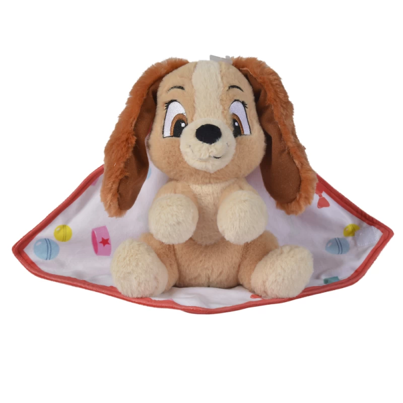 Peluche Lady le chien du film La belle et le clochard dans sa couverture avec scratch de 25 cm.